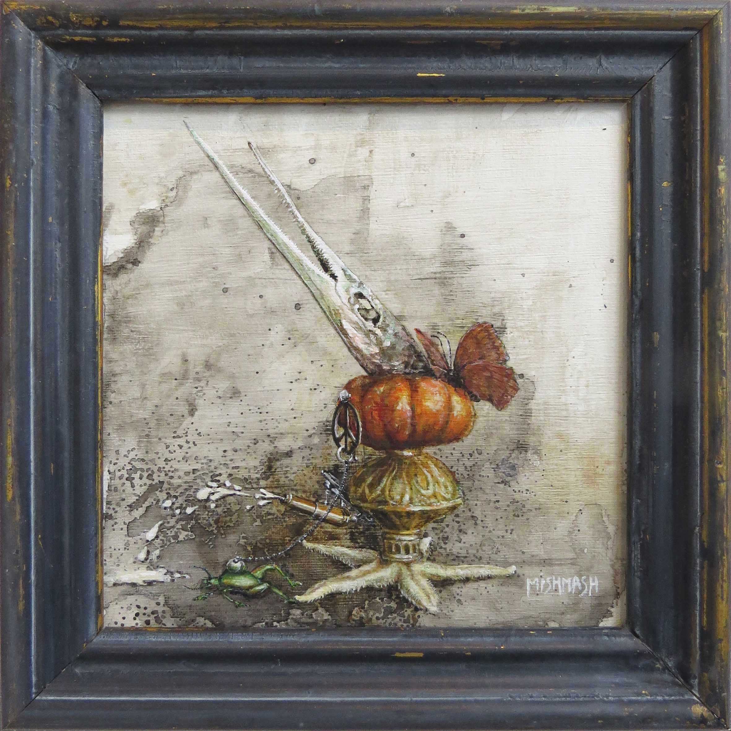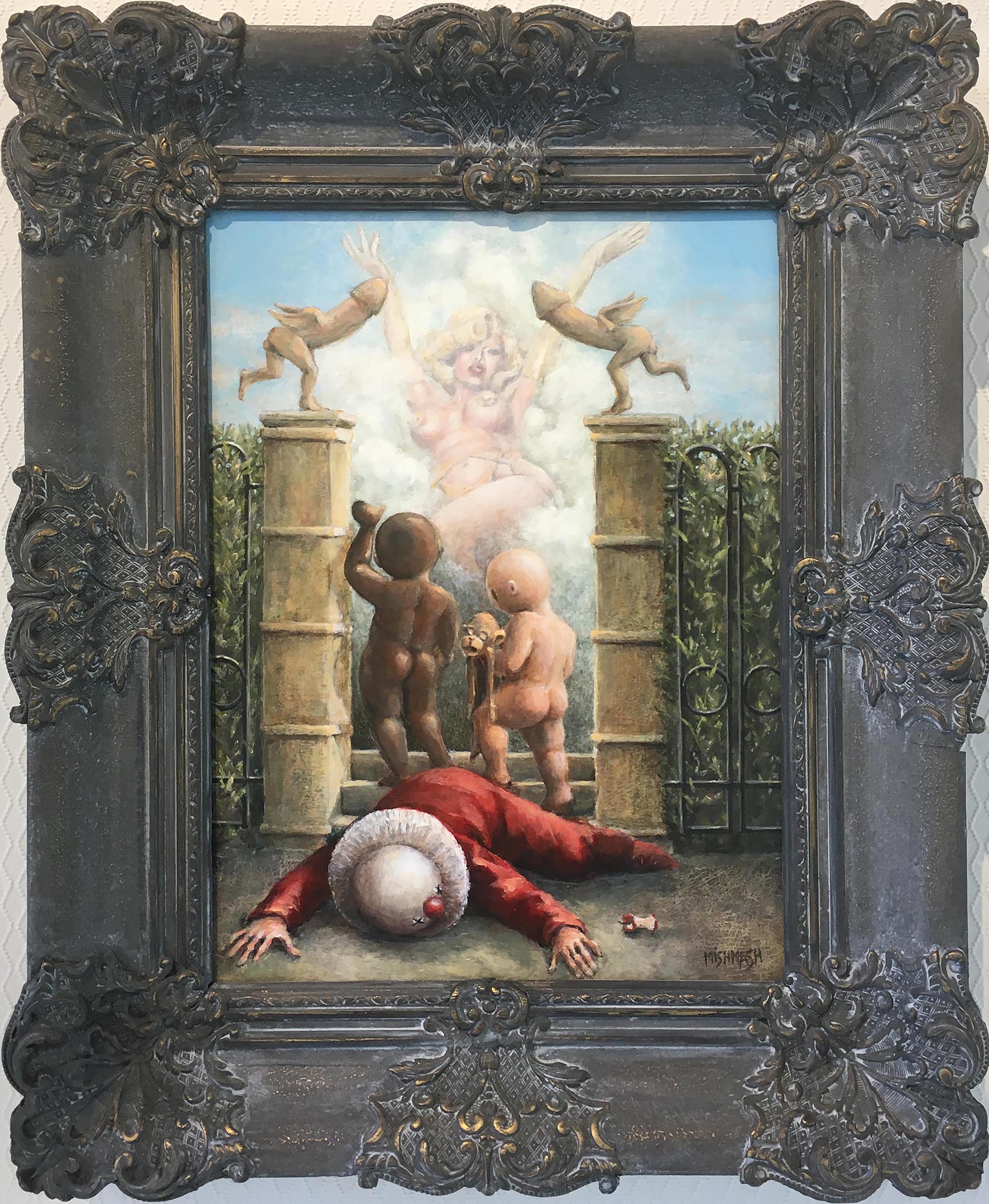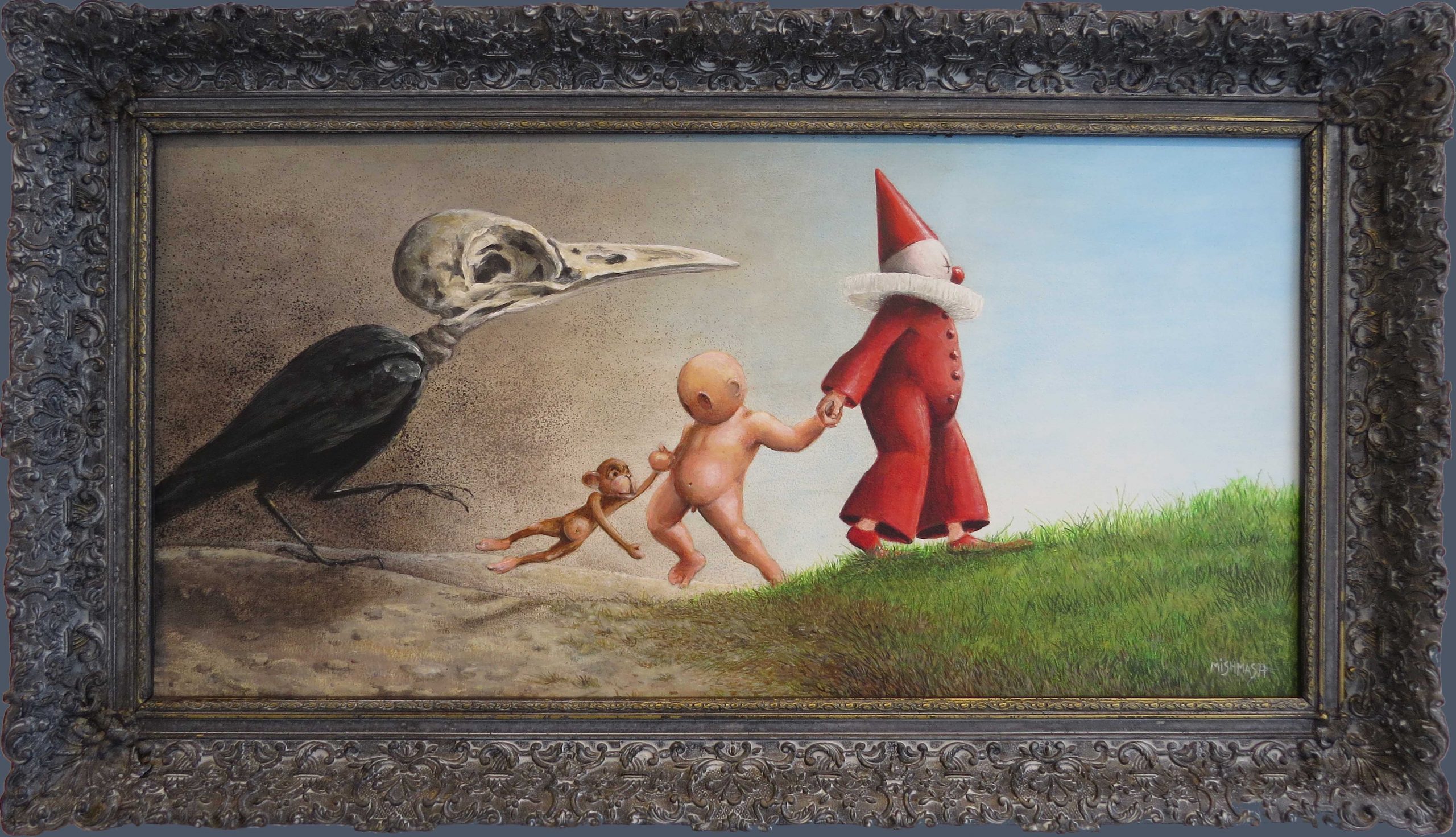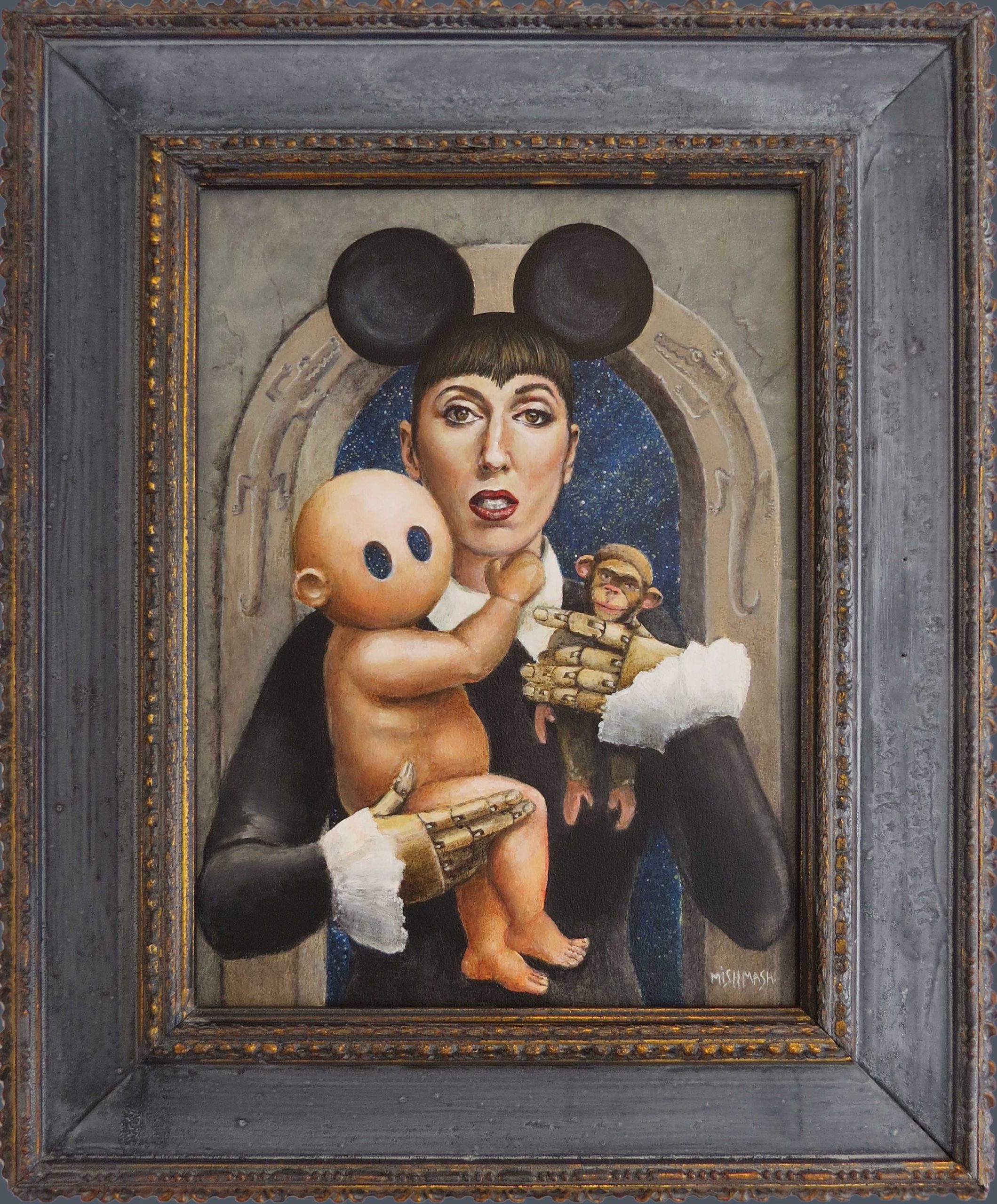 De schilderijenserie “Not For The Faint Hearted” is een serie moderne schilderijen geïnspireerd op figuren uit de mythologie, religie, symboliek, sprookjes en populaire cultuur uit de hele wereld. Door deze figuren die oorspronkelijk niets met elkaar te maken hebben op een actuele en eigenzinnige manier te combineren ontstaat een nieuwe context die resulteert in humoristische en aansprekende kunst met een nieuw verhaal …….. dat de kijker soms kan shockeren. Een verhaal waar iedereen zijn eigen invulling aan kan geven …….. dat is aan de toeschouwer! Geschilderd met acrylverf op houten panelen of canvas. Waar mogelijk hergebruikt Mishmash antieke lijsten voor deze schilderijen. In verschillende maten, van 110 x 110 cm tot 20 x 20 cm.
