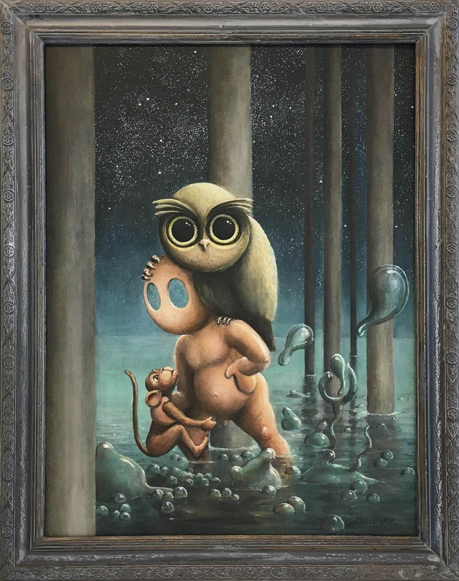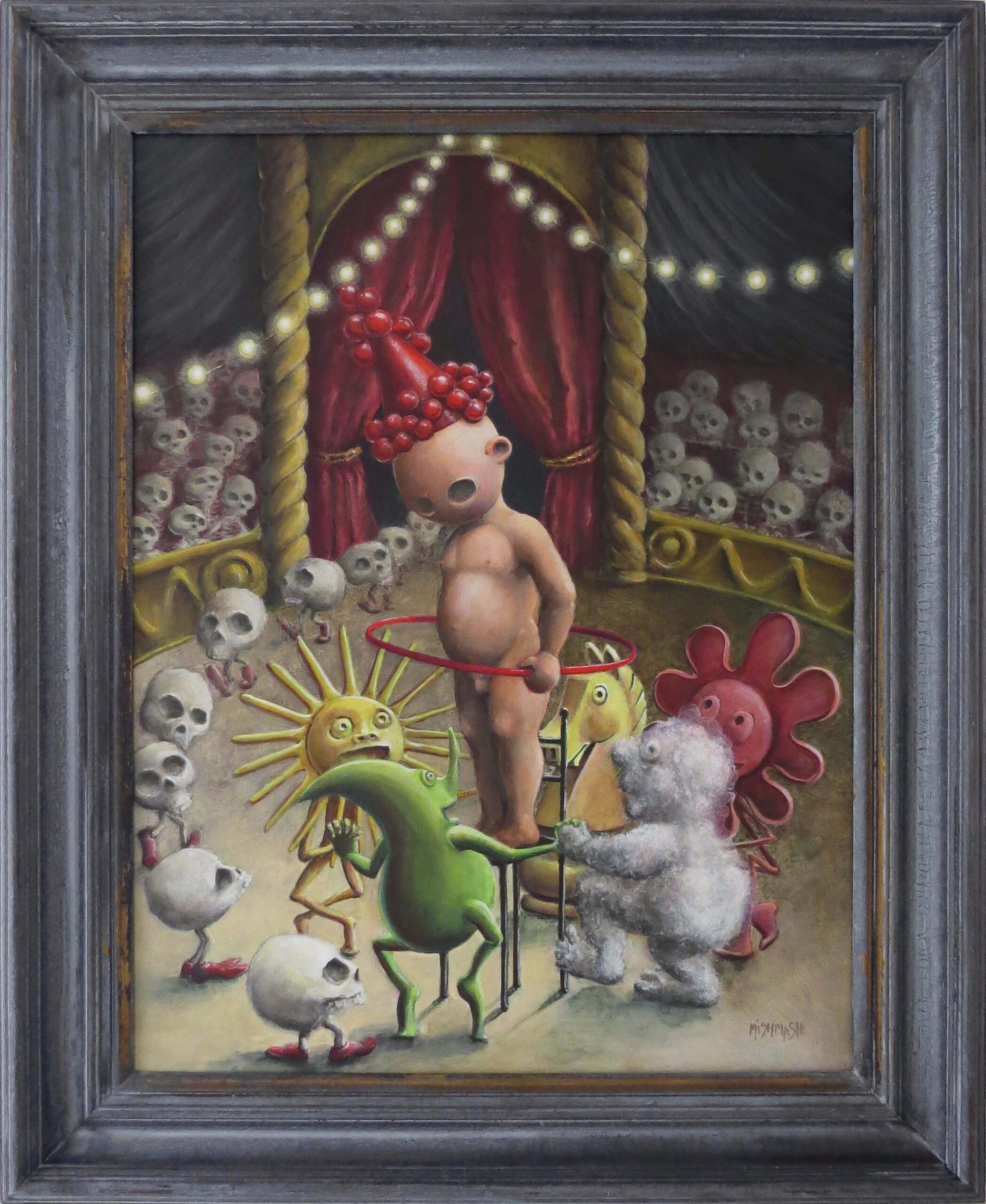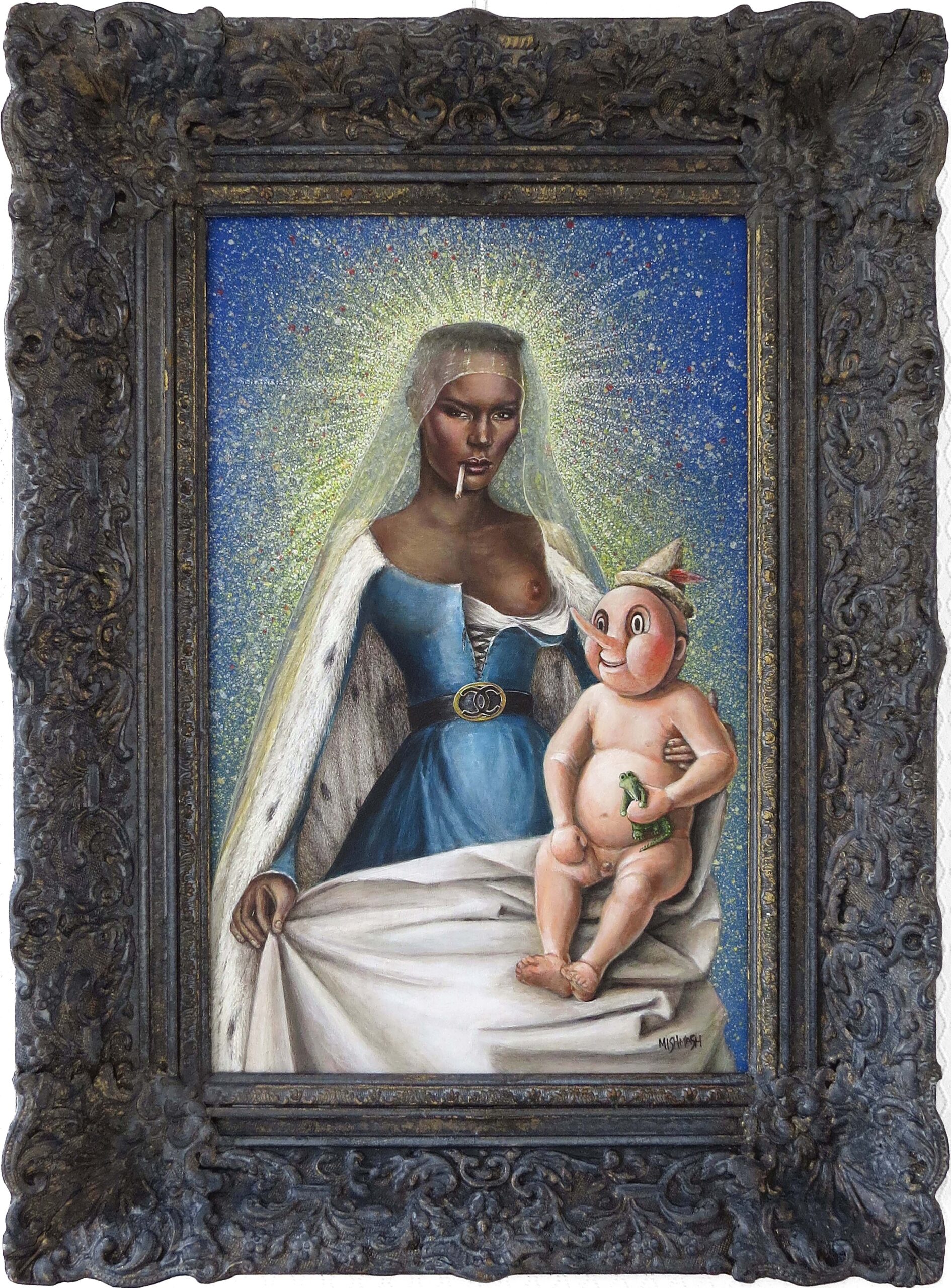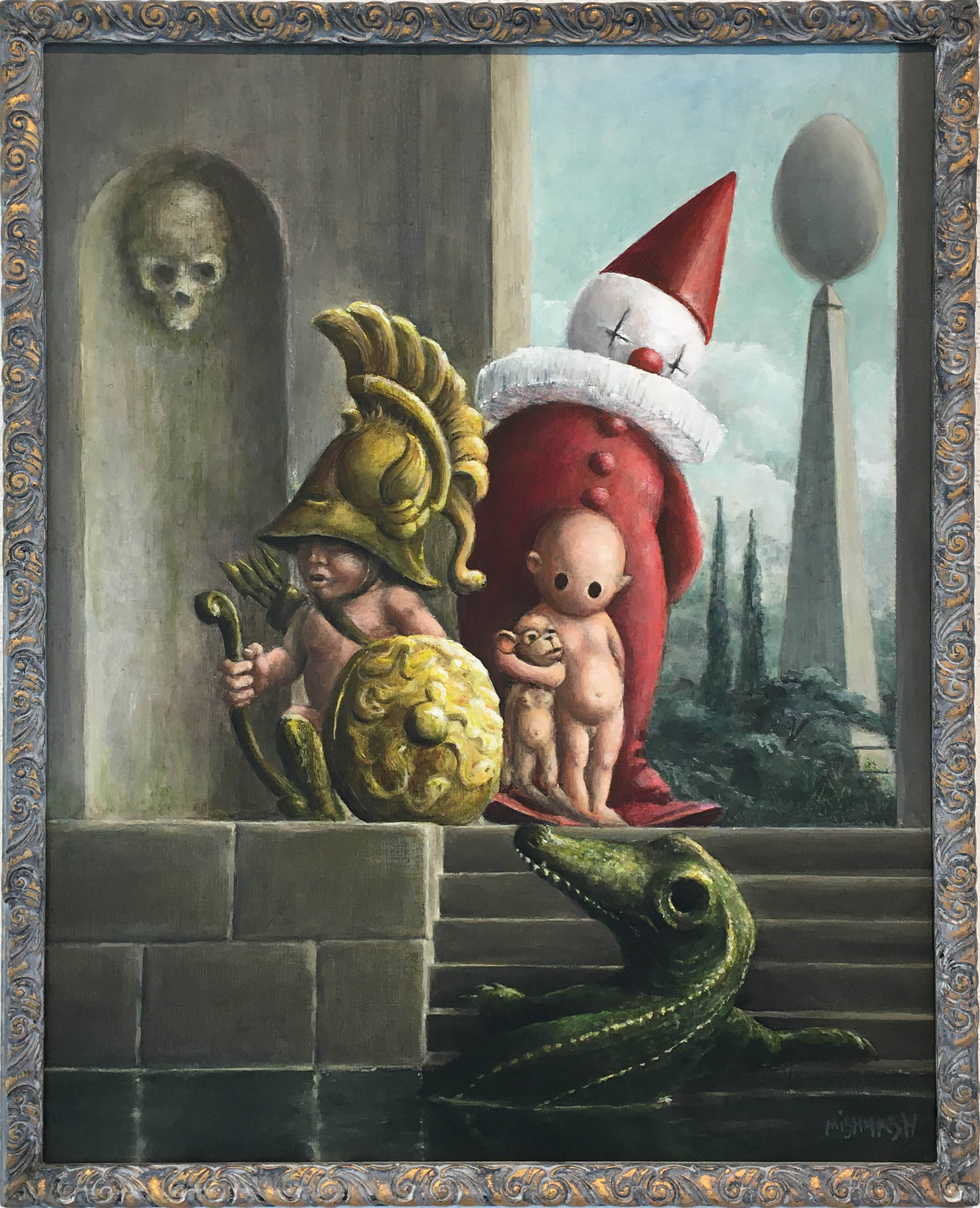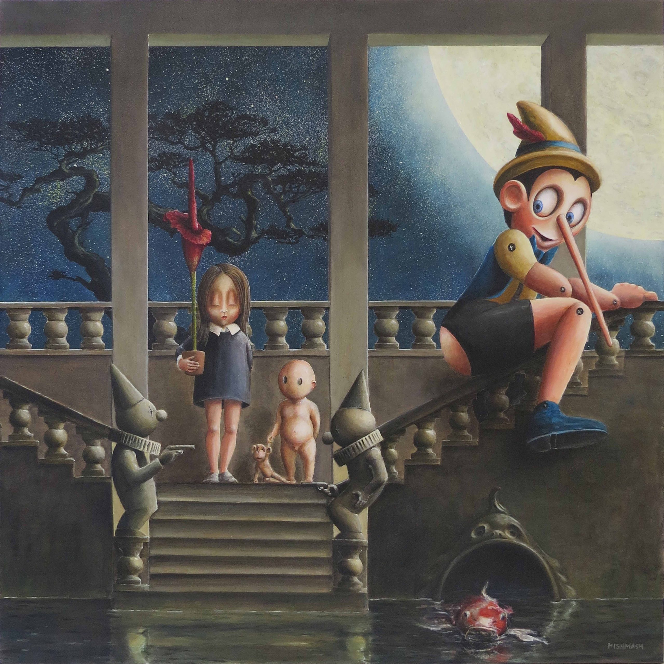 De schilderijenserie “Not For The Faint Hearted” is een serie moderne schilderijen geïnspireerd op figuren uit de mythologie, religie, symboliek, sprookjes en populaire cultuur uit de hele wereld. Door deze figuren die oorspronkelijk niets met elkaar te maken hebben op een actuele en eigenzinnige manier te combineren ontstaat een nieuwe context die resulteert in humoristische en aansprekende kunst met een nieuw verhaal …….. dat de kijker soms kan shockeren. Een verhaal waar iedereen zijn eigen invulling aan kan geven …….. dat is aan de toeschouwer! Geschilderd met acrylverf op houten panelen of canvas. Waar mogelijk hergebruikt Mishmash antieke lijsten voor deze schilderijen. In verschillende maten, van 110 x 110 cm tot 20 x 20 cm.